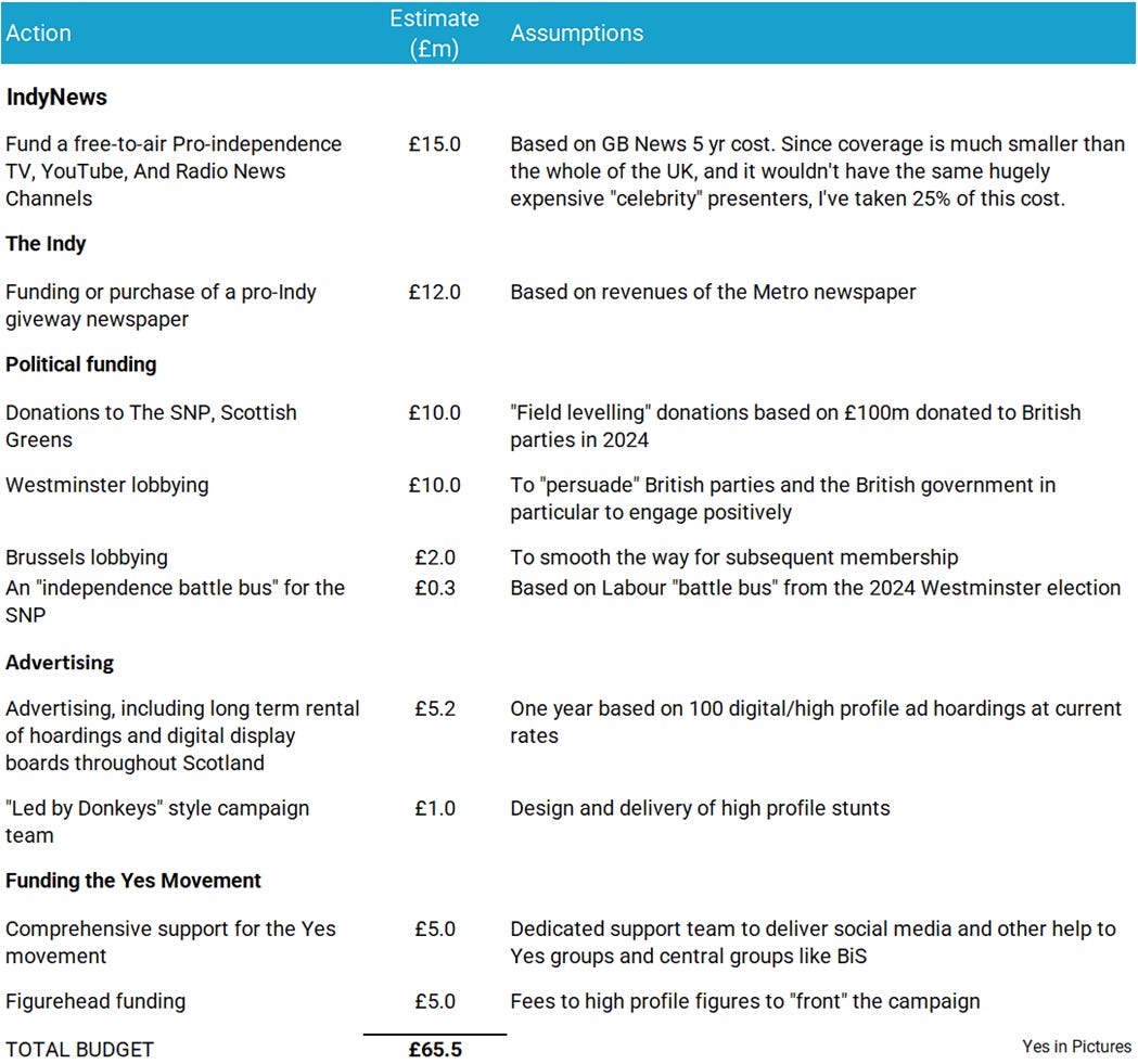 My budget comes to £65.5m. For a billionaire intent on giving Scotland independence, that’s easily affordable. Here’s how I’d spend that money.